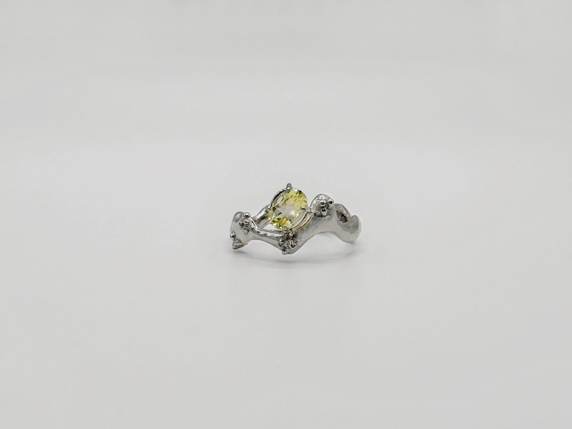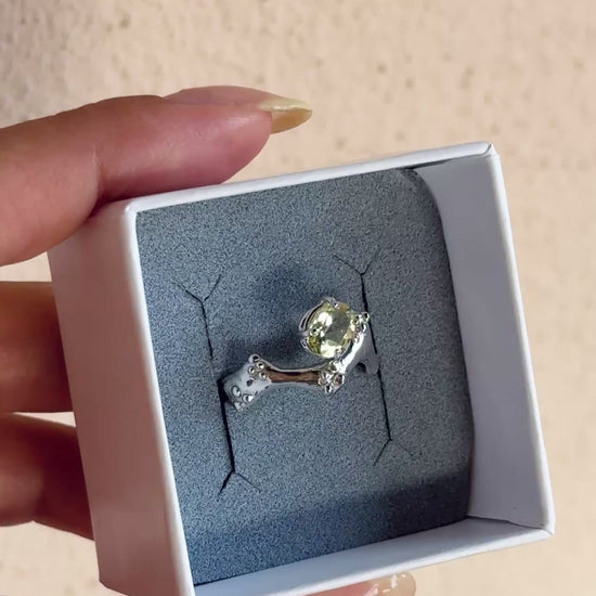 Rhodium-plated 925 silver ring handmade in Italy using the lost-wax casting technique, enriched with granular details and oval-cut lemon quartz.