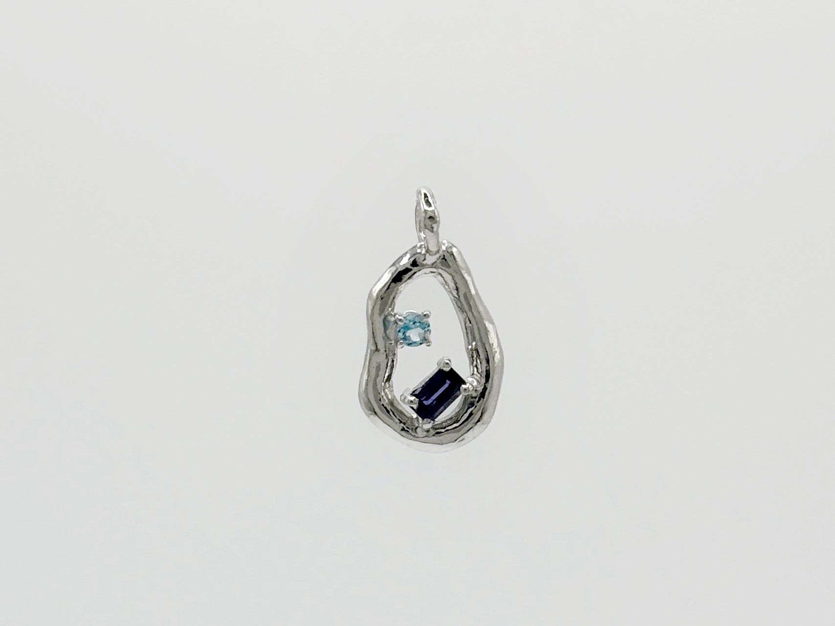 Ciondolo in Argento 925 rodiato realizzato a mano in Italia tramite la tecnica della fusione a cera persa, con un topazio azzurro tondo e una iolite taglio ottagonale.