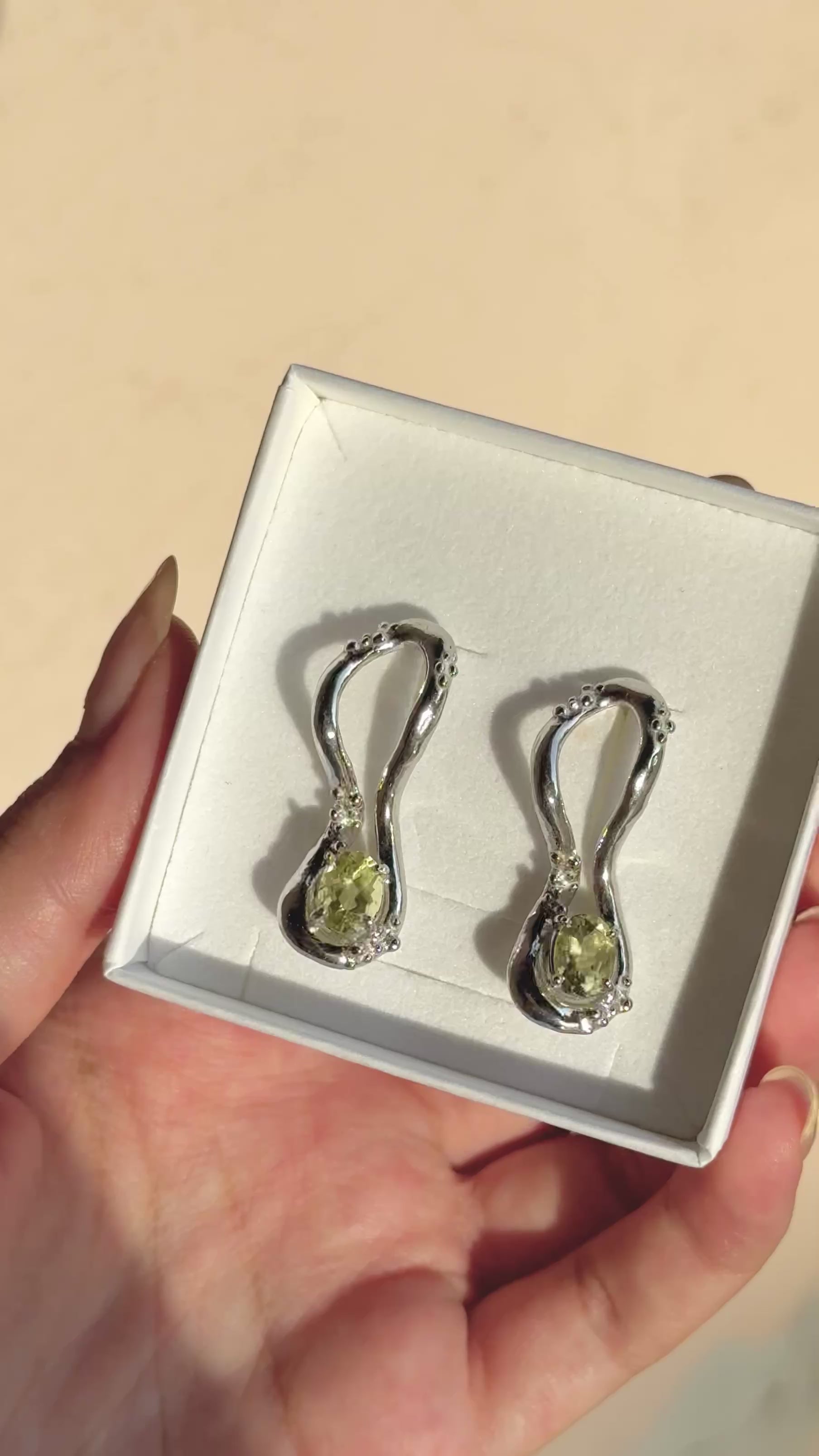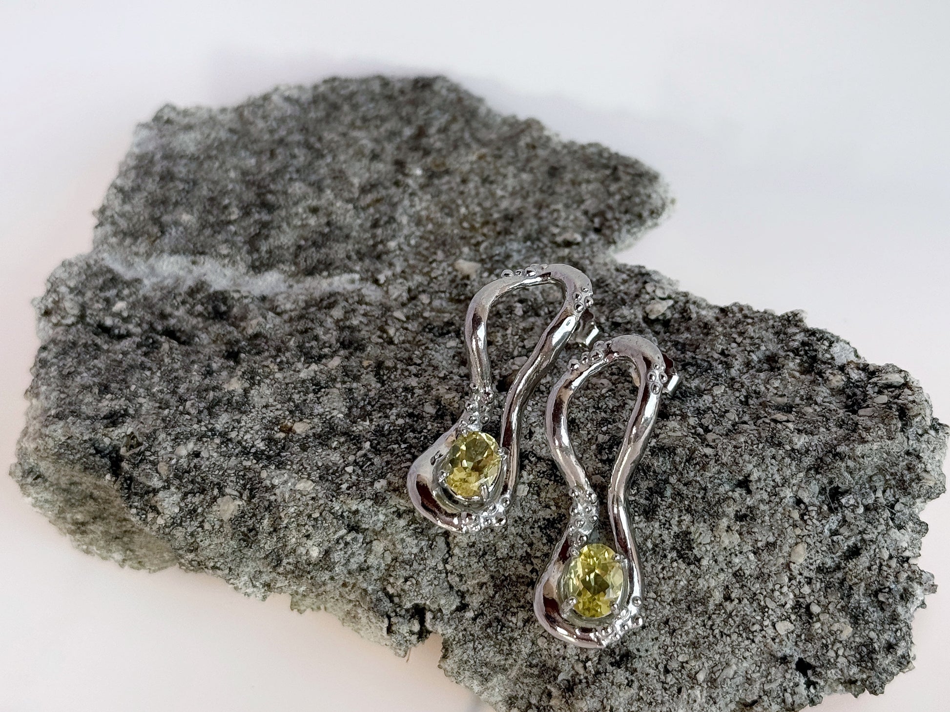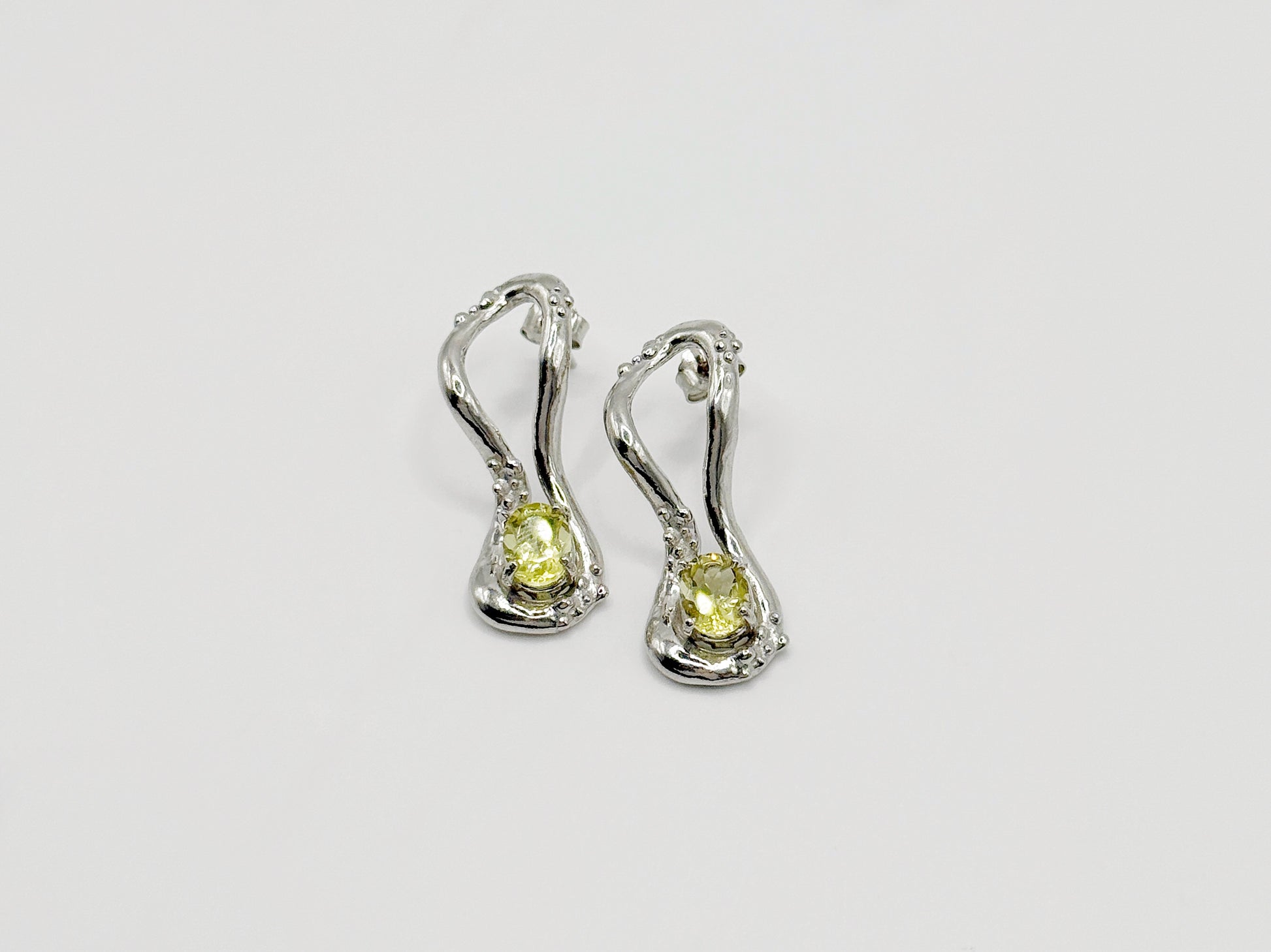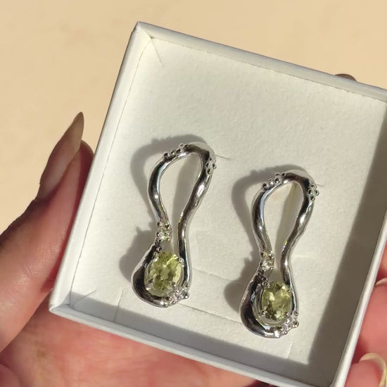 Orecchini in Argento 925 rodiato, realizzati a mano in Italia tramite la tecnica della fusione a cera persa. Questi orecchini dalla forma fluida sono arricchiti da piccole decorazioni granulari e dalla presenza di un quarzo lemon a taglio ovale. GLI ORECCHINI SONO VENDUTI IN COPPIA.